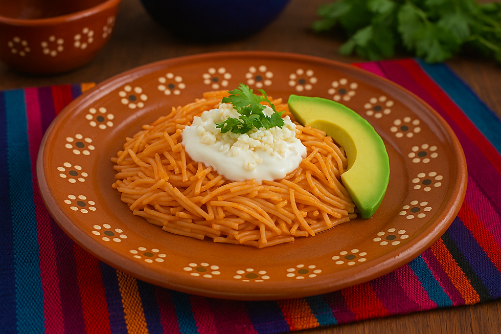 Sirve el fideo seco caliente, acompañado de crema, queso fresco, aguacate y un toque de cilantro.